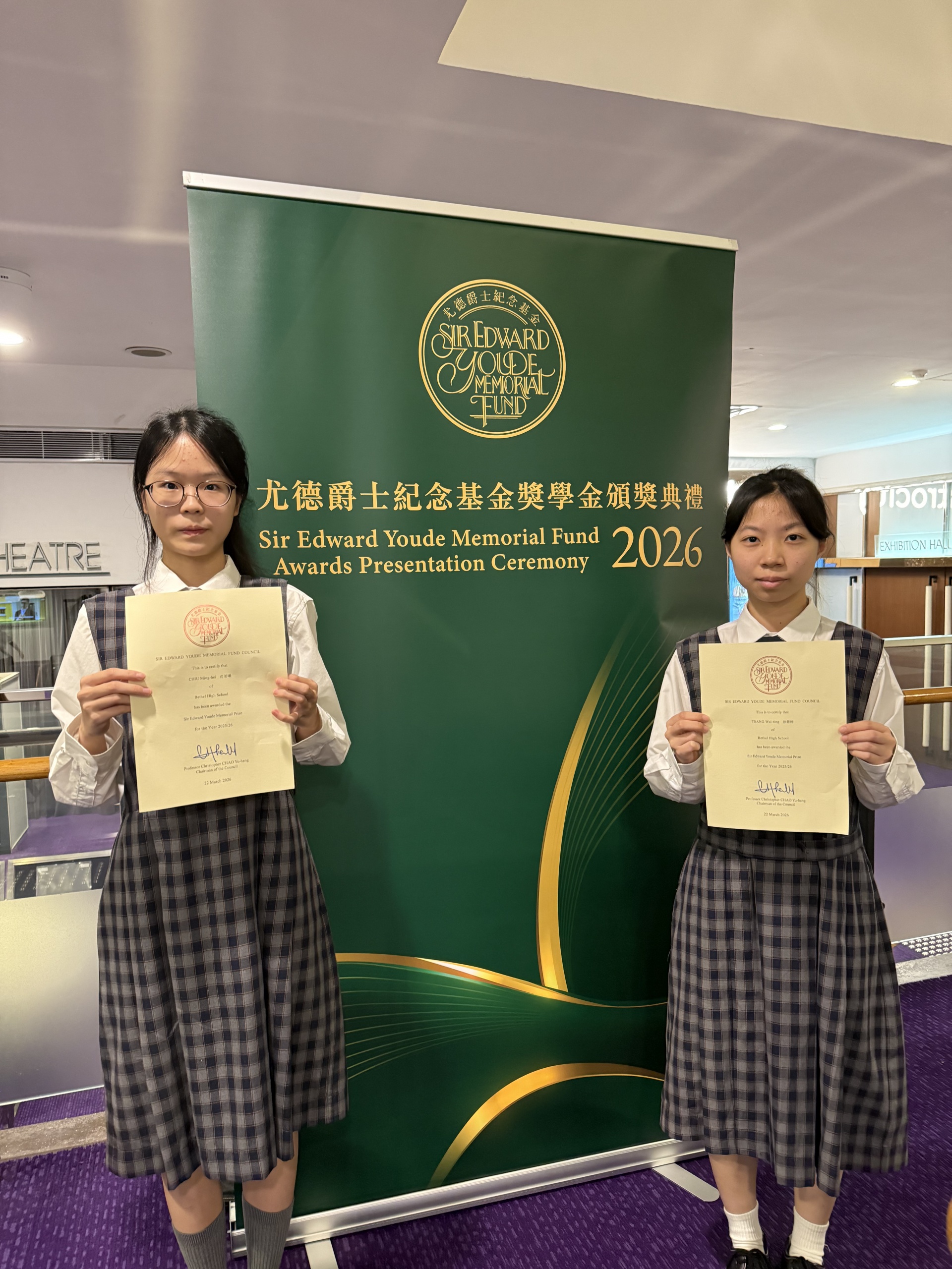 6A Tsang Wai Ting and 6B Chiu Ming Hei won the 2025/26 Sir Edward Youde Memorial Prizes for Senior Secondary School Students. The awards presentation ceremony is held on March 22, 2026 at the Hong Kong City Hall Concert Hall. The scheme offers prizes to encourage senior secondary school students in Hong Kong in attaining a high standard of learning abilities and developing leadership qualities.